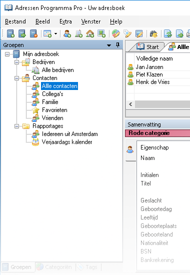 Met het interne tag en categorieën systeem van Adressen Programma Pro kunt u uw adressen makkelijk markeren in door u gekozen tags en categorieën. Tevens heeft u de mogelijkheid om adressen in meer dan één tag en/of categorie in te delen. Naast deze manier van groeperen kunt u ook zoekvragen samenstellen die controleren op bepaalde velden van een contact in combinatie met enkele tags en categorieën. Dankzij deze manier van groeperen kunt u ook makkelijk acties op de groep van contacten uitvoeren, zoals een groepsmail of de complete groep exporteren.